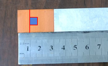 为了避免样品边缘对测试结果造误差,图2中红色线条为线切割切割路线图,图中蓝色区域为阻抗测试样品,样品切口镶嵌后用于测试涂层厚度。样品另一端用于百格测试,测试涂层的结合力。