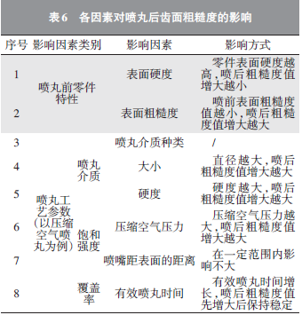 由喷丸的原理可知,高硬度、高速运动的弹丸在零件表面留下无数凹坑,这是残余压应力的来源,同时这些凹坑势必会使表面粗糙度增大。喷丸前零件的特性以及喷丸工艺参数都会影响喷丸后的粗糙度,如表6所列。本文第3节中,4种工艺条件下,喷丸后齿面粗糙度均增大,增大程度不同。该试验中存在喷前粗糙度和工艺参数(饱和强度或覆盖率)两个变量,无法准确得出喷丸后粗糙度与各单一影响因素之间的关系。目前,很多学者对此做过研究,并且在有限元模拟基础上提出了喷丸后表面粗糙度的理论预测模型,用于预测不同喷丸工艺对应的粗糙度值。