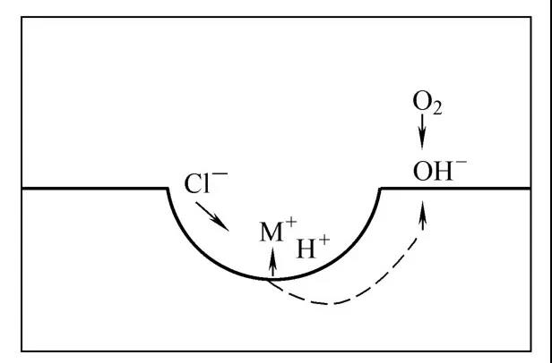 已形成的蚀孔随着腐蚀的继续进行。小孔内积累了过量的正电荷,引起外部Cl-的迁入以保持电中性,继之孔内氯化物浓度增高。由于氯化物水解使孔内溶液酸化,又进一步加速孔内阳极的溶解。这种自催化作用的结果,使蚀孔不断地向深处发展,如图2所示。