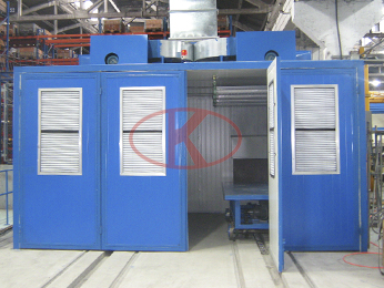 喷漆室/喷涂室:水帘式喷漆室、油帘式喷漆室、干式喷漆室/房、水旋式喷漆室、自动或半自动工件输送式喷漆室、风淋喷漆室、喷烘一体化设备; 执行喷涂方式:人工、往复升降机、机器人。 喷漆室/喷漆房是提供涂装作业专用环境的设备,在喷漆室/房中制造的人工环境,能满足涂装作业对环境的温度、湿度、照度、洁净度的需求;能保护操作者的安全卫生;能治理涂装作业的废气排放,保护环境免遭污染。 干式喷漆室/喷涂室是采用漆雾折流阻挡系统及漆雾过滤系统对喷漆时产生的漆雾进行收集及捕捉,在漆雾过滤系统的前道采用漆雾折流阻挡系统作为粗级过滤,以减轻漆雾过滤系统的负担。漆雾通过漆雾过滤系统后的过滤效率达99%。漆雾折流阻挡系统过滤装置是由数块弓形板相对啮合组成,安装在喷漆室排气口前面,当含漆雾的空气通过漆雾折流阻挡系统间隙时,气体流动方向产生水平和垂直两次曲折,使漆雾与漆雾折流阻挡系统碰撞,把涂料颗粒粘附在板内。漆雾折流阻挡系统过滤装置采用优化结构设计,不产生阻塞现象。二级过滤采用滤网型漆雾捕捉器亦称漆雾过滤系统,其结构是把玻璃纤维制成滤网固定在框架两面成为垫状。滤网型过滤器特点是不仅能捕集带有粘性的涂料颗粒,而且也能捕集失去粘性的涂料颗粒,随着捕集漆雾量的增加,滤网的孔目会被堵塞,影响过滤效果,这时需要更换新网,失去作用的滤网烧掉废弃即可,处理简单,三级过滤采用活有机废气活性碳过滤系统对废气进行收集过滤,过滤后的空气随风机排出。
